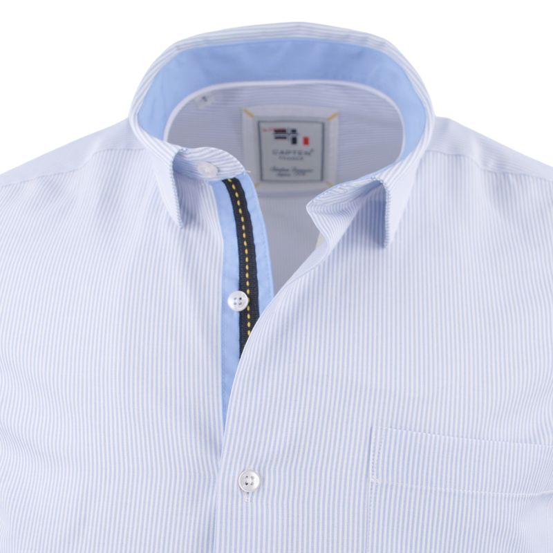 Nous avons sélectionné ce modèle car habituellement la chemise rayée a une connotation habillée, notamment dans les modèles MARVELIS et ETERNA qu’on vous propose. Chez CAPTEN, la rayure a un style décontractée car très discrète et en contraste avec le patch sur la patte de boutonnage.