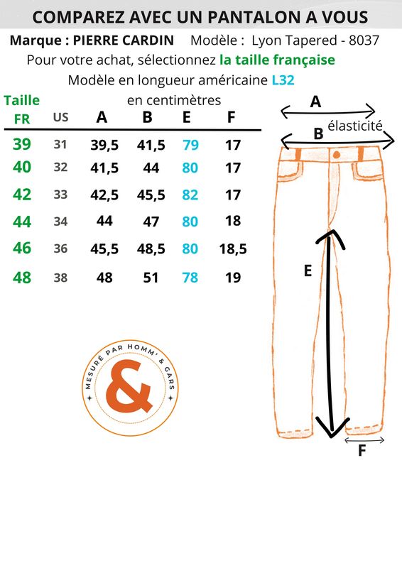Ce modèle est la coupe Lyon Tapered en Futureflex : une technologie qui donne de l’élasticité et au repos le jean reprend sa forme afin qu’il ne se déforme pas dans le temps. Ecologiquement, PIERRE CARDIN a réalisé ce jean en coton organique et lyocell.