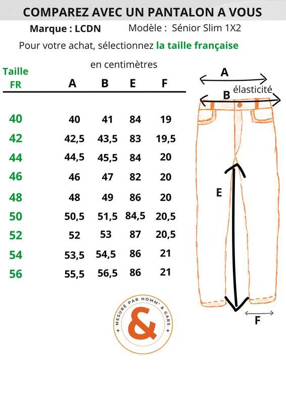 Si vous êtes un adepte du côtelé un peu large, LCDN vous propose ce modèle en vert tilleul et en marine. Un pantalon avec de belles finitions comme sa double attache crochet et bouton. Au niveau de la ceinture il y a très peu d’élasticité donc consultez notre guide des tailles.