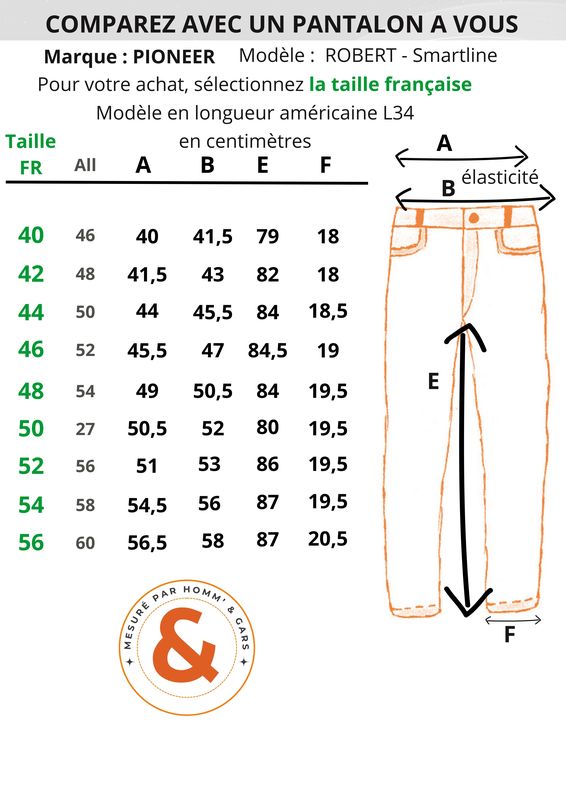 Un pantalon de la marque PIONEER en coupe Robert Smartline, donc plus étroit que le Robert classique au niveau cuisse et cheville. Un pantalon qui vous donnera une allure élancée et qui conviendra pour une sortie un peu habillée. Ce modèle est idéal à porter en automne et en hiver (poids de 500 grammes en taille 44)