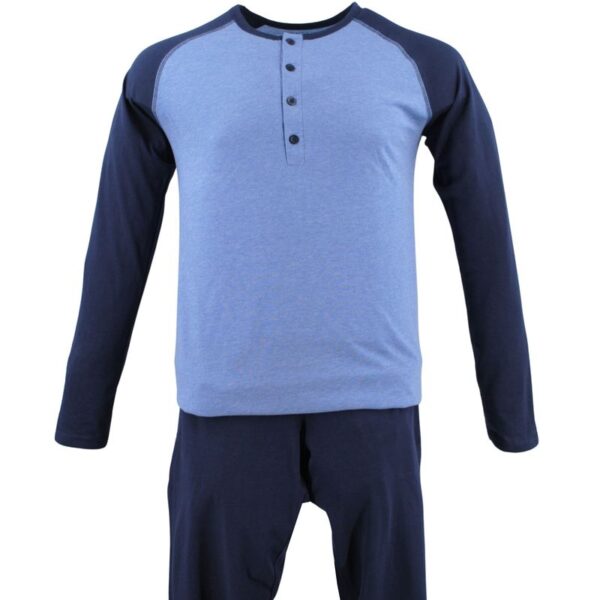 Pyjama en coton classique d’une épaisseur permettant de le porter au printemps, en été et aussi en hiver pour les non frileux. Le haut est ciel devant et derrière, les manches sont marines. Le pantalon a une finition dite jogger avec un bord côte sur les chevilles.
